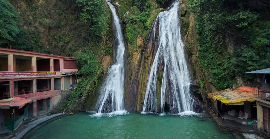 The Kempty Falls, 12 m (40 ft) high and 1,400 m (4,500 ft) above sea level, is 15 km (9.3 mi) from Mussoorie, accessed by track from Kempty Fall Road.